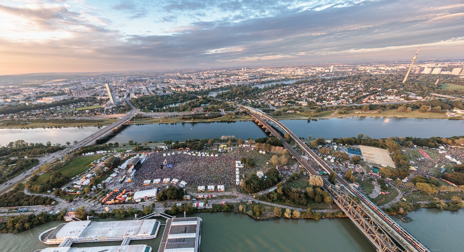 Donauinsel is a 21km long and 250m wide island in the River Danube, which flows through Vienna. Performances take place in the festival area which is 4.5 km long and consists of 18 festival areas and 13 different open-air stages in 16 tented areas around the island. Stages are added or removed depending on the performance lineup.